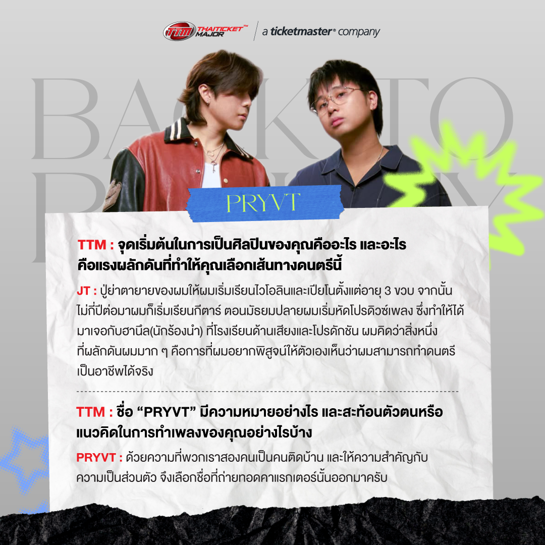 PRYVT : จากเดิมที่พวกเราอยากแค่เขียนเพลง และอยู่ในห้องนอน พวกเราได้ค้นพบความสุขจากการแสดงสดและการออกไปพบโลกภายนอกเพื่อส่งต่อเสียงดนตรีให้กับผู้คนมากขึ้นครับ