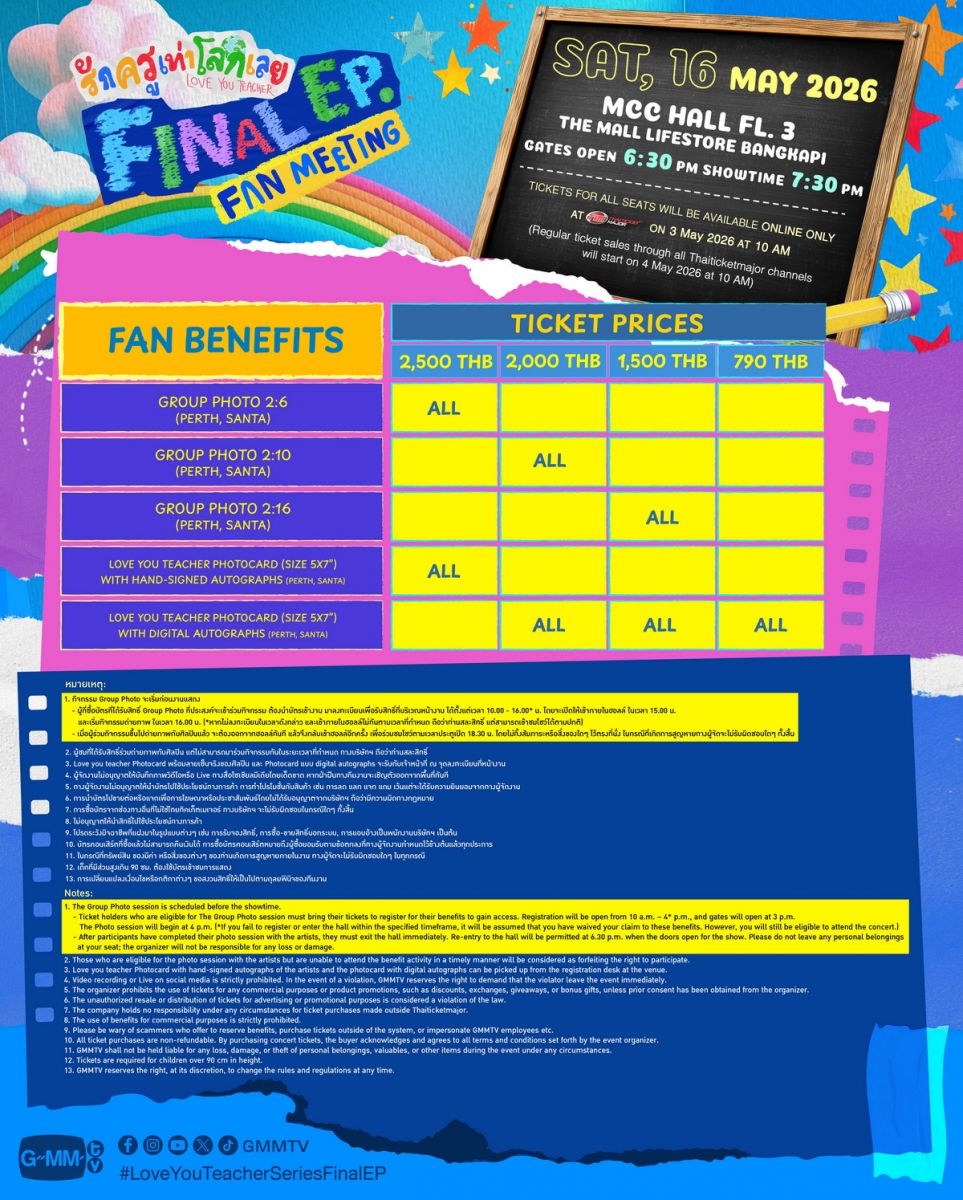 สำหรับผู้ที่สนใจสามารถจองบัตรเข้าร่วมงาน “รักครูเท่าโลกเลย Final EP. FAN MEETING” เปิดจำหน่ายบัตร บนช่องทาง Online : วันอาทิตย์ที่ 3 พฤษภาคม 2569 เริ่มเวลา 10:00 น. เป็นต้นไป เปิดจำหน่ายทุกที่นั่ง ทางออนไลน์ที่ www.thaiticketmajor.com เท่านั้น และเปิดจำหน่ายบัตร ทุกช่องทางตามปกติ : วันจันทร์ที่ 4 พฤษภาคม 2569 เริ่มเวลา 10:00 น. เป็นต้นไป บัตรราคา 2,500 / 2,000 / 1,500 / 790 บาท ทางไทยทิคเก็ตเมเจอร์ทุกสาขา, www.thaiticketmajor.com และ Call center โทร 0-2262-3456 หรือติดตามรายละเอียดเพิ่มเติมได้ที่ www.thaiticketmajor.com และ Facebook / In-stagram / X / TikTok / YouTube / Weibo: GMMTV